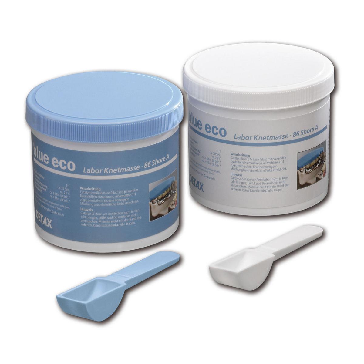 Knetmasse für die Zahntechnik, additionsvernetzend, sehr hohe Konsistenz, knetbar. Präzise Detailwiedergabe, form- und volumenstabil, weichgeschmeidig, hitzebeständig bis 200 °C. Standard Endhärte, ca. 86 Shore A, vielseitig einsetzbar. Exzellente Mischkontrolle durch Kontrastfarben. Base blau, Katalysator weiß 1:1.