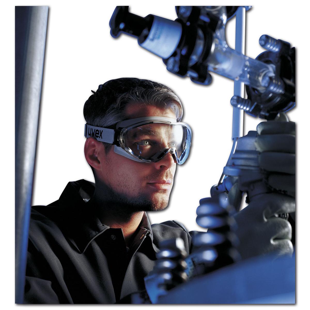 Vollsichtbrille mit außerordentlichem Tragekomfort. Durch Kombination von zwei unterschiedlichen Materialien bereitet selbst dauerhaftes Tragen keine Druckprobleme. Die flexible Weichkomponente schmiegt sich dem Gesichtsverlauf individuell an und gewährleistet umfassenden seitlichen Schutz des Augenraumes, sogar bei Brillenträgern. Die hervorragende Ventilation sorgt für ein angenehmes und reizfreies Klima im Augenraum. Sportliches Design, weites Panoramablickfeld sowie schneller und leichter Scheibenwechsel. Für Laborarbeiten, chemische Industrie, Bereiche mit hoher Staubbelastung und Schweißerarbeiten.