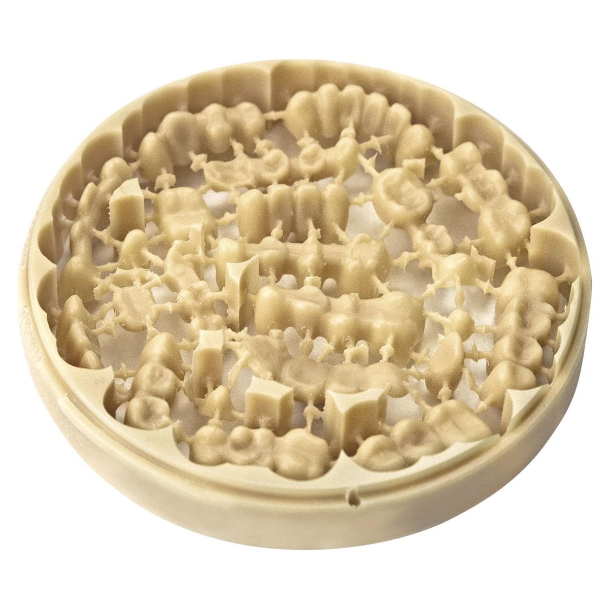 Das Wachs wurde speziell auf die dentale CAD/CAM Technik abgestimmt. Sehr hoher Schmelzpunkt. Hervorragende technische Eigenschaften erlauben eine zügige maschinelle Bearbeitung. Ein Ergebnis von 100 % Ausbrennbarkeit und glatter Gussoberflächen. Die Wachseigenschaften ermöglichen das Herstellen auch von grazilsten Formen. Ein Schrumpf oder Verzug des gefrästen Objekts ist ausgeschlossen. Es können bis zu 79 Einheiten pro Scheibe gefräst werden.