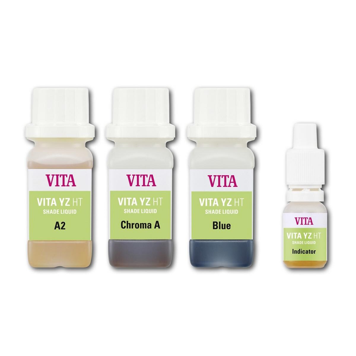Flüssigkeiten zum individuellen Einfärben von monolithischen VITA YZ HT-Restaurationen vor dem Sinterprozess. VITA YZ HT SHADE LIQUID´s werden in sieben VITA classcal A1 - D2 Farben und in sieben VITA SYSTEM 3D-MASTER Farben sowie weiteren Zusatzfarben für den Zahnfleisch-, Zahnhals- und Schneidebereich angeboten.