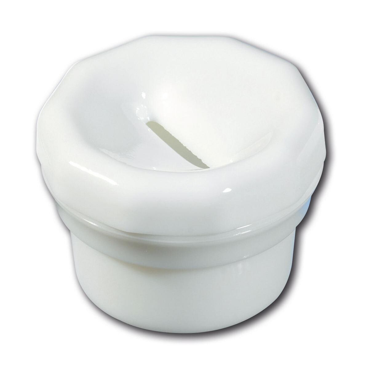 Bohrerreinigungsbehälter aus Derfla-Opalglas mit Schlitzlochdeckel und Siebeinsatz. Sterilisierbar.