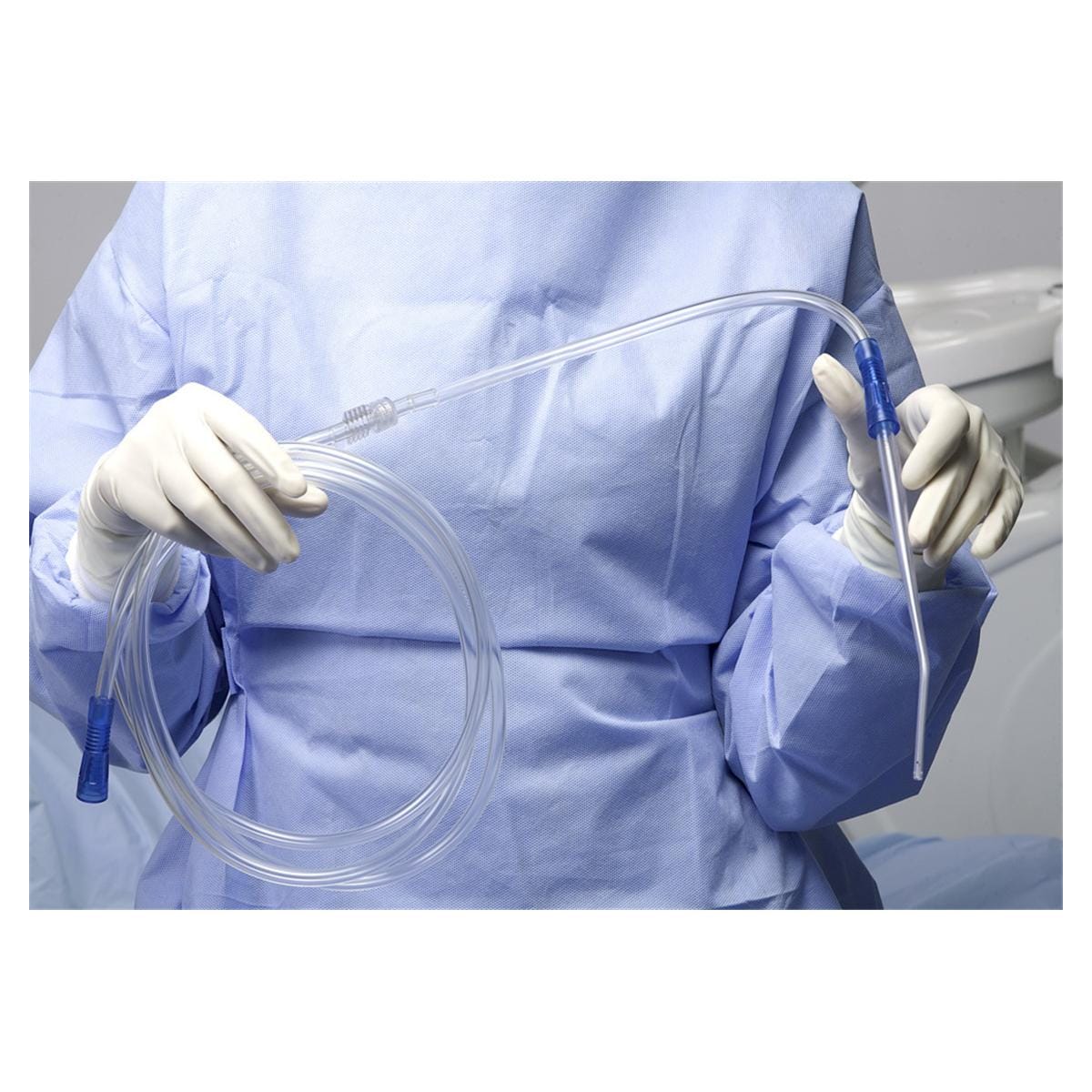 Der Absaugschlauch mit Yankauer-Kanüle ist bei allen chirurgischen Eingriffen angezeigt, bei denen ein präzises Absaugen ohne Einschränkung der Sicht auf den Operationsbereich erforderlich ist. Die besonderen kranzförmig an der Kanülenspitze angeordneten Düsen verhindern das unabsichtliche Ansaugen kleiner Gewebeteile bei Eingriffen der plastischen Zahnfleischchirurgie. Der Sauger besteht aus PVC Medical Grade und ist transparent, um das Absorbieren des OP-Lampenlichts und eine Verdunklung des Operationsbereichs zu verhindern. Der Absaugschlauch wird serienmäßig mit umknickgeschützten Anschlussstücken und mit Ansatz für Knochenfilter zur Gewinnung autologen Knochenmaterials angeboten.