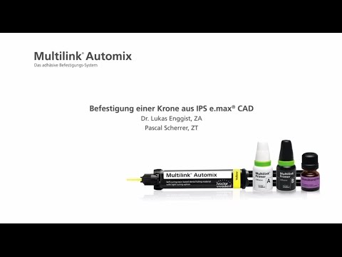 Adhäsive-Befestigungs-System für die Befestigung von indirekten Restaurationen aus Silikat- und Oxidkeramik (z.B. IPS e.max), Metall und Metallkeramik sowie Composite. Neue, optimierte Formel, zusätzliche Farbe „Weiß“, Try-In Pasten und optimiertes Handling. Dank der intelligenten Weiterentwicklung der Easy Clean-Up Formulierung lassen sich die Überschüsse von Multilink Automix mittels der Vierteltechnik jetzt noch einfacher entfernen. Multilink Automix und der Multilink Primer sind jetzt bei Raumtemperatur lagerbar.