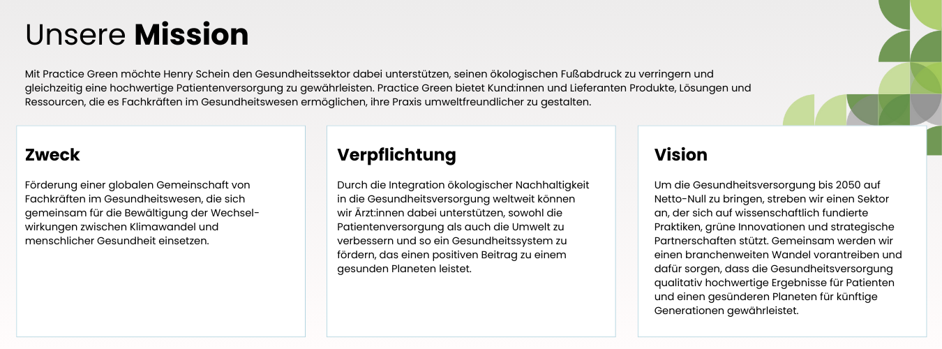 Die im Practice Green-Portfolio bereitgestellten Produkte wurden von Henry Schein sorgfältig als „grün“ ausgewählt, basierend auf den Marketinginformationen des Lieferantenpartners für das Produkt, dass es entweder wieder verwendbar ist, recycelte Materialien enthält, recycelt werden kann oder biologisch abbaubar ist oder sind aus nachhaltiger Quelle.